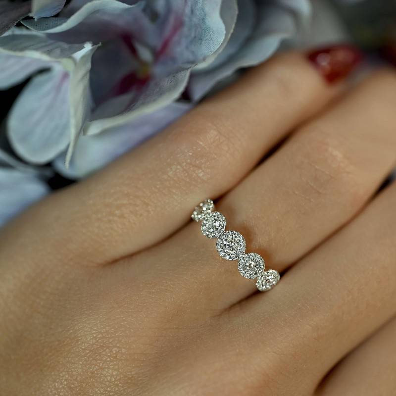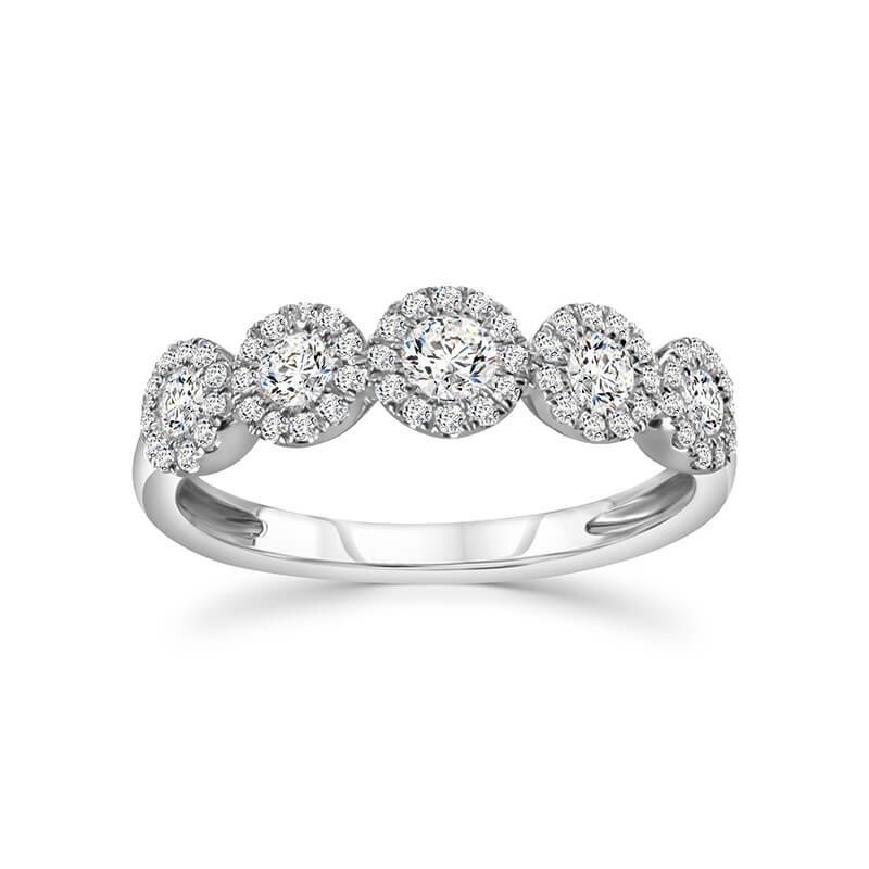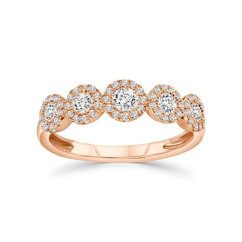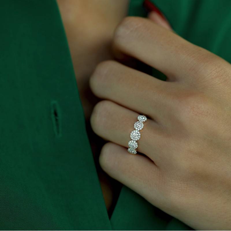 Elle est ornée de 61 diamants d'une pureté remarquable, totalisant 0,47 carats. Le design de cette bague est caractérisé par cinq diamants magnifiquement alignés sur le corps de la bague, créant un effet enchanteur. Chaque diamant est soigneusement sélectionné pour son éclat exceptionnel, ajoutant une touche de brillance à votre main.